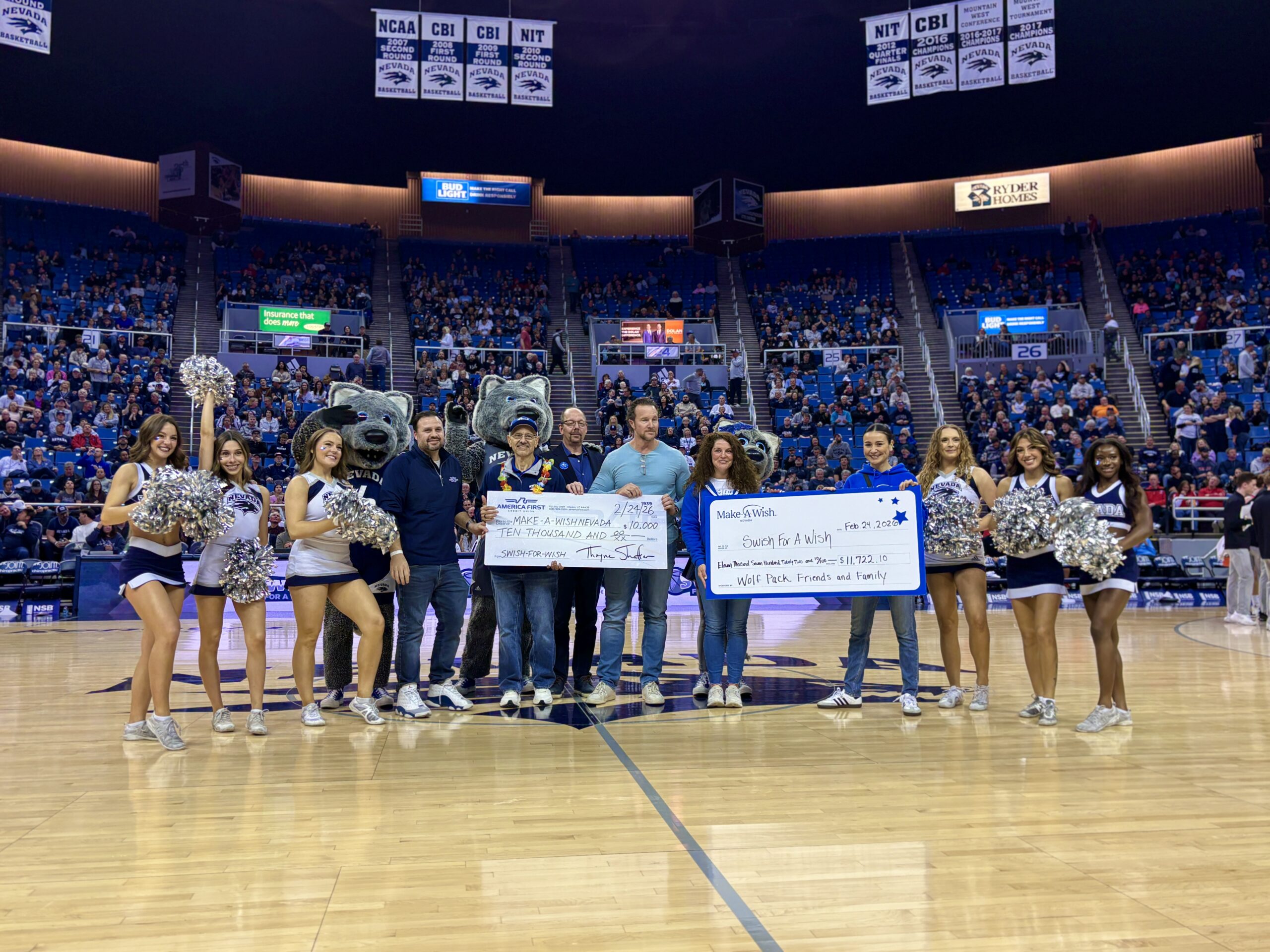 “Swish for a Wish” encourages fans, businesses, and members of the community to support wish-granting efforts by pledging donations based on the number of free throws made by the Wolf Pack during the season. Supporters can also participate by making a one-time donation. QR codes placed throughout America First branches in northern Nevada and displayed during the game made it easy for fans to contribute.